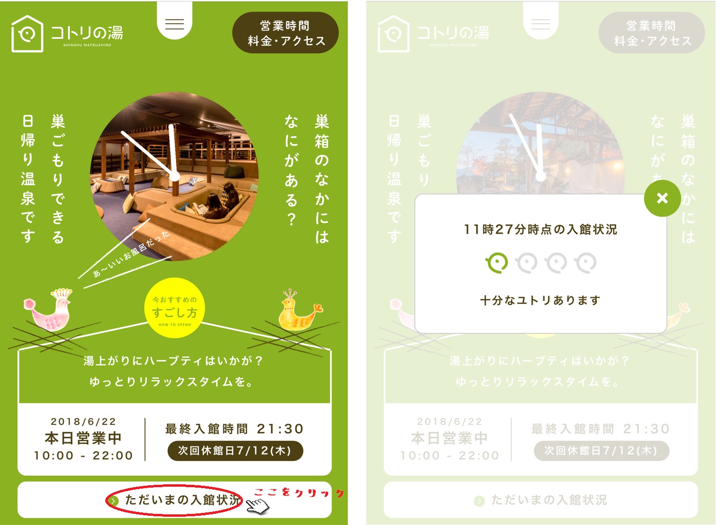 「コトリの湯」館内の混雑/閑散状況について、目安が確認できるようになりました。 ホームページのトップ画面にあります、『ただいまの入館状況』をクリックしてください。 おおよそですが、お客様の在館数目安が表示されます。 こちらをご確認の上、ご来館くださいませ。