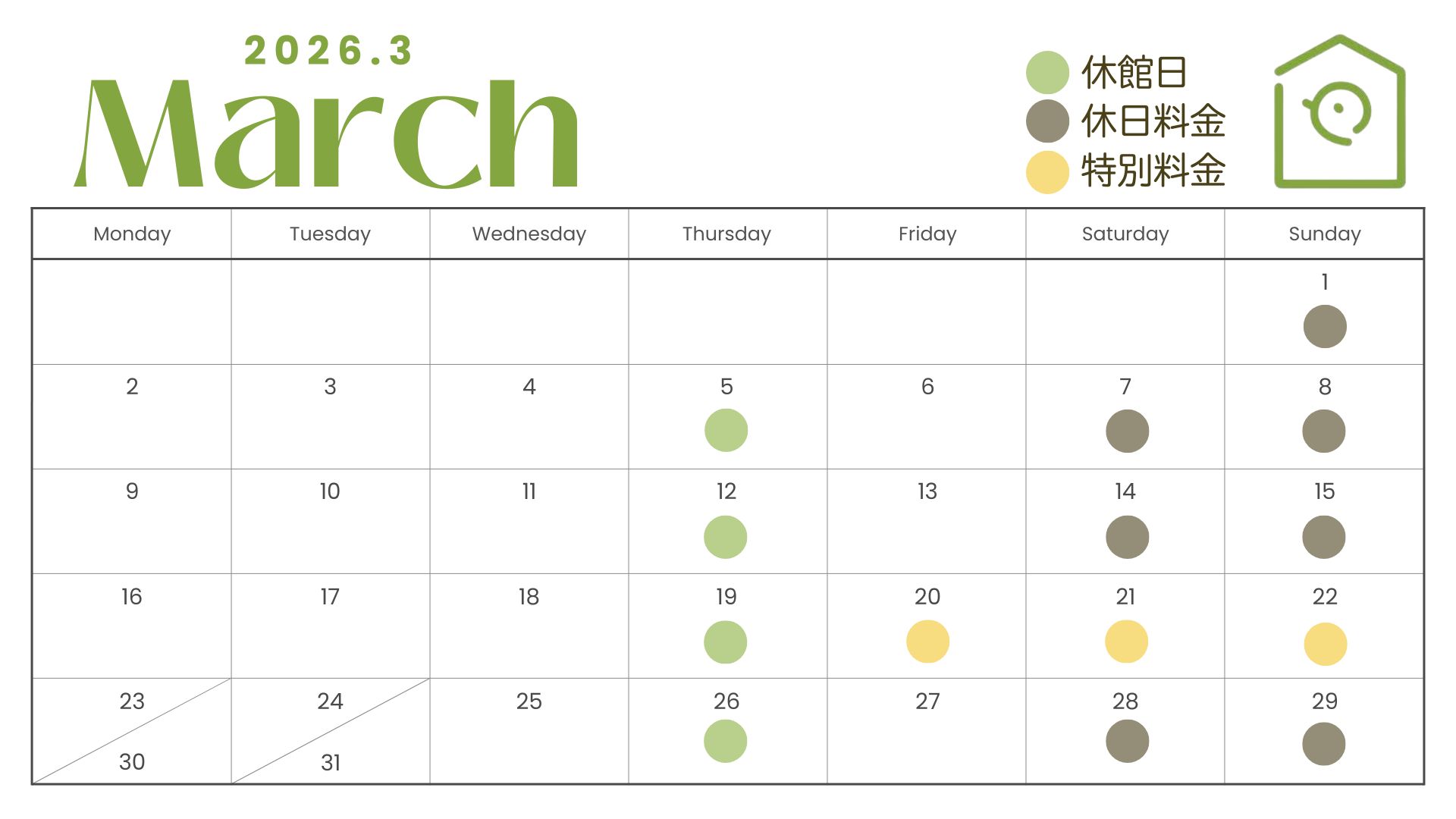 日頃よりコトリの湯をご愛顧いただきまして誠にありがとうございます。 3月の営業カレンダーをお知らせいたします。 特別料金 〇巣ごもりプラン 大人 1050円 子ども 550円 〇ひとっぷろプラン 大人 800円 子ども 400円 〇シジュウカラプラン 大人 950円 子ども 500円 〇ラストワンプラン 大人 600円 子ども 350円 皆様のお越しを心よりお待ちしております。